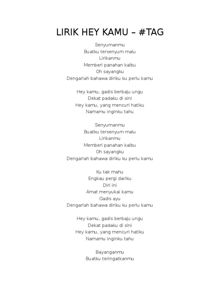 Hey kamu gadis berbaju ungu Dekat padaku di sini Hey kamu yang mencuri hatiku Namamu inginku tahu. Lirik Lagu Hey Kamu Hashtag tag tag Malaysia. Hey kamu yang mencuri hatiku namamu inginku tahu senyumanmu buatku tersenyum malu.